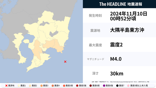11月10日0時52分頃、宮崎県・鹿児島県で最大震度2の地震を観測