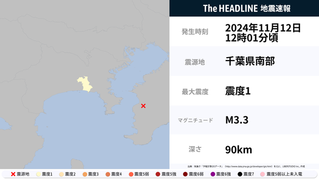 11月12日12時1分頃、千葉県南部を震源とするマグニチュード3.3の地震が観測された。最大震度1を観測したのは、神奈川県。