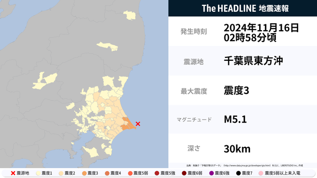 11月16日2時58分頃、千葉県東方沖を震源とするマグニチュード5.1の地震が観測された。最大震度3を観測したのは、茨城県・千葉県。