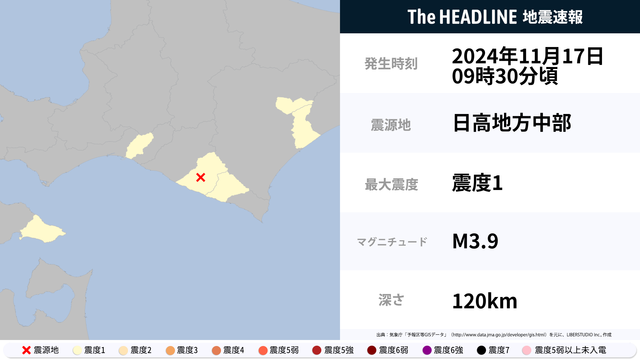 11月17日9時30分頃、日高地方中部を震源とするマグニチュード3.9の地震が観測された。最大震度1を観測したのは、北海道。