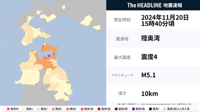 11月20日15時40分頃、青森県で最大震度4の地震を観測