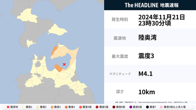 11月21日23時30分頃、陸奥湾を震源とするマグニチュード4.1の地震が観測された。最大震度3を観測したのは、青森県。