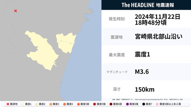 11月22日18時48分頃、宮崎県で最大震度1の地震を観測