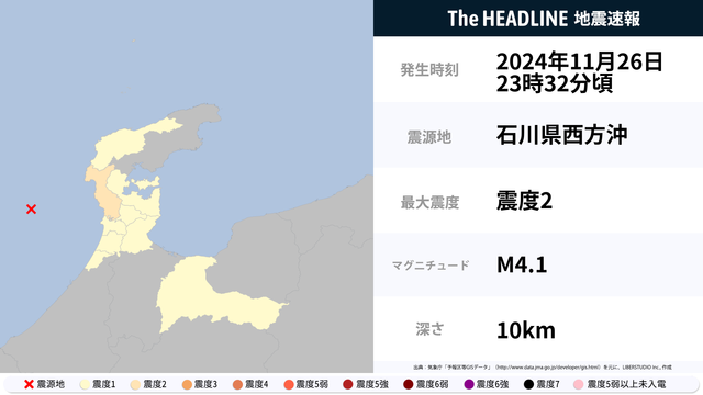 11月26日23時32分頃、石川県西方沖を震源とするマグニチュード4.1の地震が観測された。最大震度2を観測したのは、石川県。