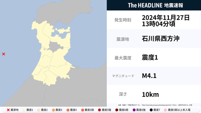 11月27日13時04分頃、石川県西方沖を震源とするマグニチュード4.1の地震が観測された。最大震度1を観測したのは、富山県・石川県。