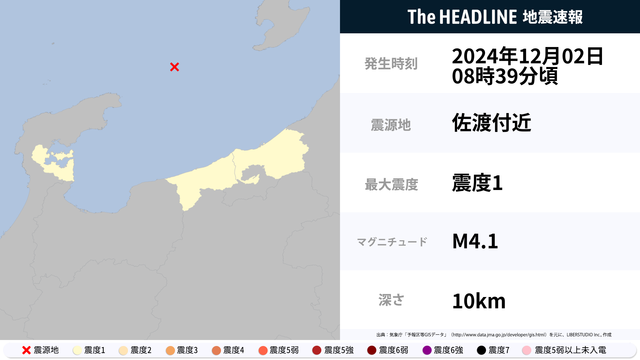 12月2日8時39分頃、佐渡付近を震源とするマグニチュード4.1の地震が観測された。最大震度1を観測したのは、新潟県・石川県。