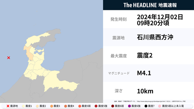 12月02日09時20分頃、石川県西方沖を震源とするマグニチュード4.1の地震が観測された。最大震度2を観測したのは、石川県。