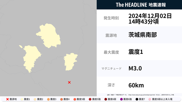 12月2日14時43分頃、茨城県南部を震源とするマグニチュード3.0の地震が観測された。最大震度1を観測したのは、茨城県・栃木県。