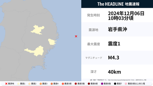 12月6日10時3分頃、岩手県沖を震源とするマグニチュード4.3の地震が観測された。最大震度1を観測したのは、岩手県。