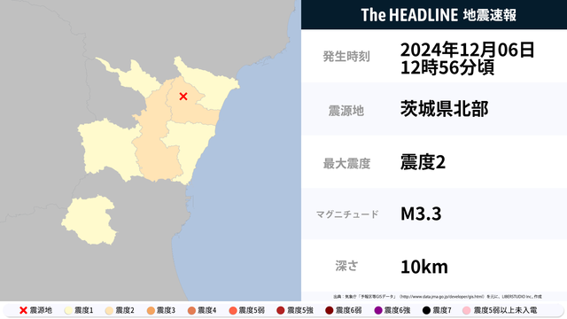 12月6日12時56分頃、茨城県北部を震源とするマグニチュード3.3の地震が観測された。最大震度2を観測したのは、茨城県。