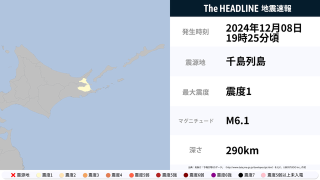 12月8日19時25分頃、千島列島を震源とするマグニチュード6.1の地震が観測された。最大震度1を観測したのは、北海道。