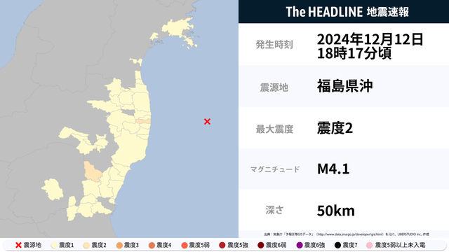 12月12日18時17分頃、福島県沖を震源とするマグニチュード4.1の地震が観測された。最大震度2を観測したのは、福島県・茨城県。