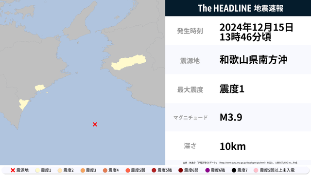 12月15日13時46分頃、和歌山県南方沖を震源とするマグニチュード3.9の地震が観測された。最大震度1を観測したのは、和歌山県・徳島県など。