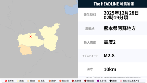 12月22日16時56分頃、高知県・熊本県などで最大震度2の地震を観測