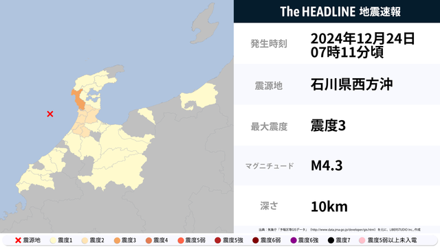 12月24日7時11分頃、石川県西方沖を震源とするマグニチュード4.3の地震が観測された。最大震度3を観測したのは、石川県。
