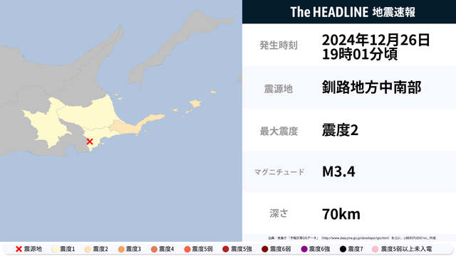 12月26日19時1分頃、釧路地方中南部を震源とするマグニチュード3.4の地震が観測された。最大震度2を観測したのは、北海道。