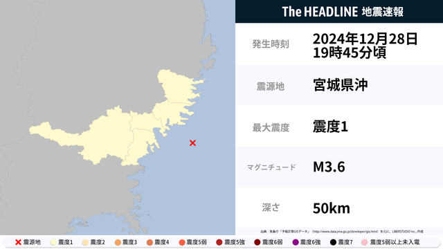 12月28日19時45分頃、宮城県沖を震源とするマグニチュード3.6の地震が観測された。最大震度1を観測したのは、岩手県・宮城県。