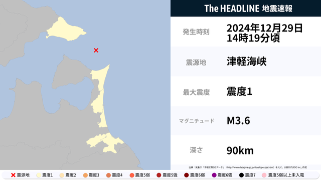 12月29日14時19分頃、津軽海峡を震源とするマグニチュード3.6の地震が観測された。最大震度1を観測したのは、北海道・青森県。