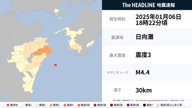 1月6日18時22分頃、日向灘を震源とするマグニチュード4.4の地震が観測された。最大震度3を観測したのは、大分県。