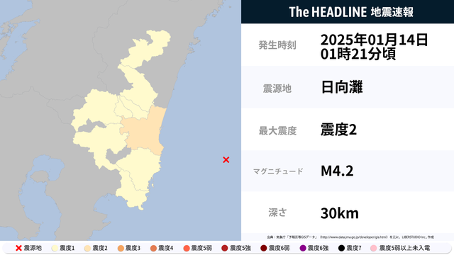 1月14日1時21分頃、日向灘を震源とするマグニチュード4.2の地震が観測された。最大震度2を観測したのは、宮崎県。