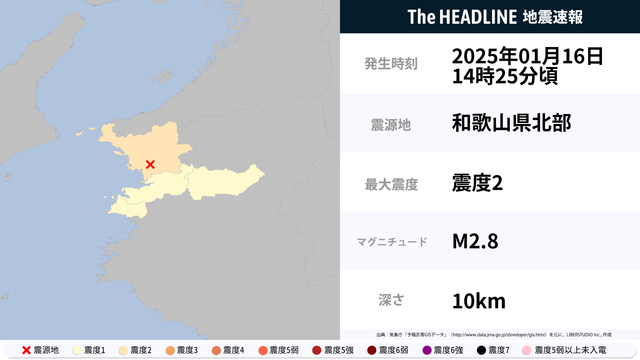 1月16日14時25分頃、和歌山県で最大震度2の地震を観測