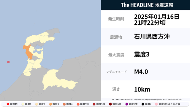 1月16日21時22分頃、石川県西方沖を震源とするマグニチュード4.0の地震が観測された。最大震度3を観測したのは、石川県。