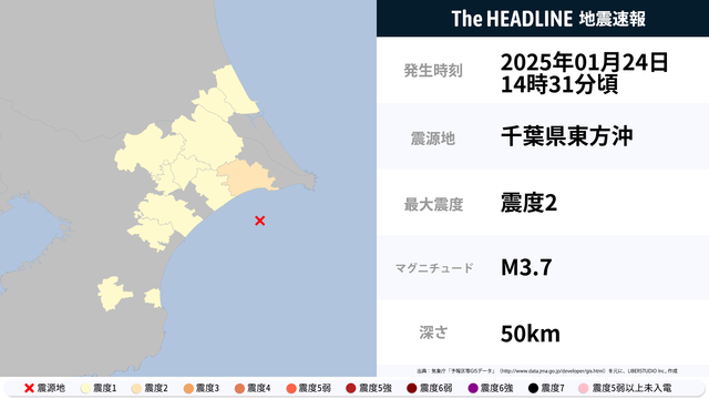 1月24日14時31分頃、千葉県で最大震度2の地震を観測