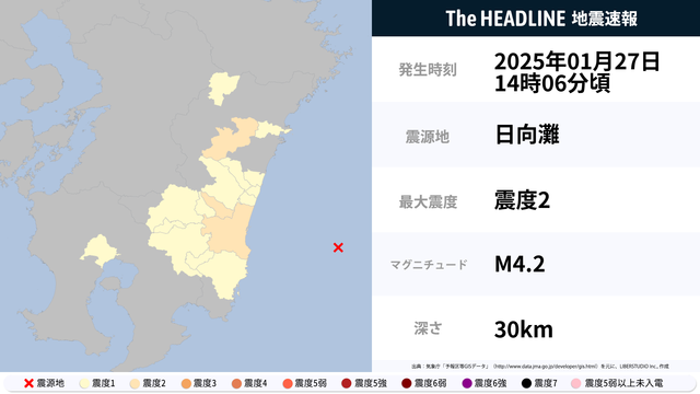 1月27日14時6分頃、日向灘を震源とするマグニチュード4.2の地震が観測された。最大震度2を観測したのは、宮崎県。
