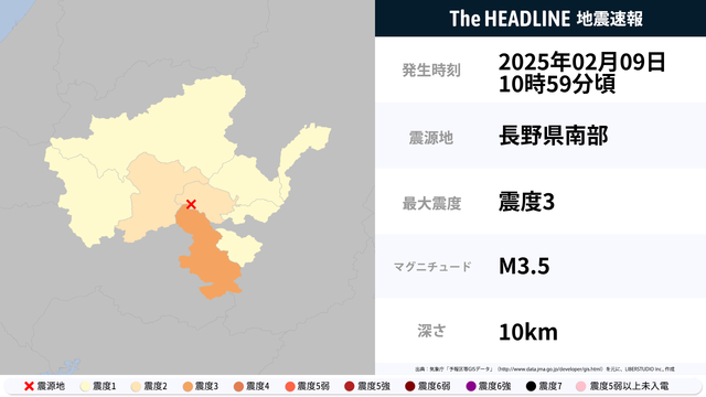 02月09日10時59分頃、長野県南部を震源とするマグニチュード3.5の地震が観測された。最大震度3を観測したのは、岐阜県。