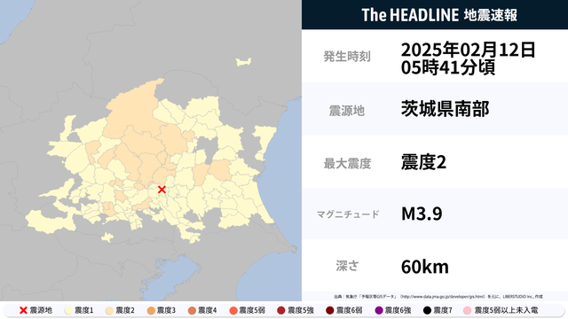 2月12日5時41分頃、茨城県南部を震源とするマグニチュード3.9の地震が観測された。最大震度2を観測したのは、茨城県・栃木県など。