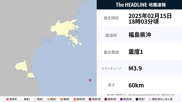 2月15日18時3分頃、福島県沖を震源とするマグニチュード3.9の地震が観測された。最大震度1を観測したのは、宮城県・福島県。