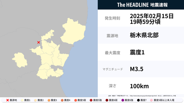 2月15日19時59分頃、栃木県北部を震源とするマグニチュード3.5の地震が観測された。最大震度1を観測したのは、福島県・茨城県など。