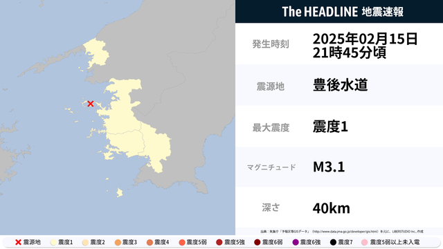 2月15日21時45分頃、豊後水道を震源とするマグニチュード3.1の地震が観測された。最大震度1を観測したのは、愛媛県・高知県。