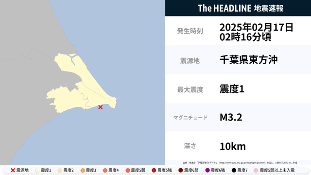 2月17日2時16分頃、千葉県東方沖を震源とするマグニチュード3.2の地震が観測された。最大震度1を観測したのは、茨城県・千葉県。