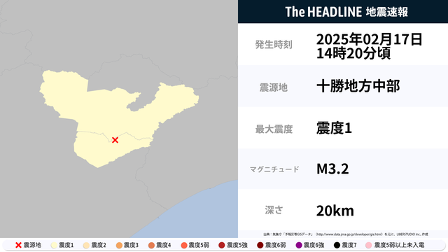 02月17日14時20分頃、十勝地方中部を震源とするマグニチュード3.2の地震が観測された。最大震度1を観測したのは、北海道。