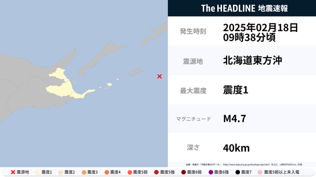 2月18日9時38分頃、北海道東方沖を震源とするマグニチュード4.7の地震が観測された。最大震度1を観測したのは、北海道。