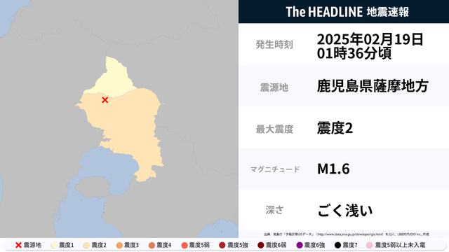 02月19日01時36分頃、鹿児島県薩摩地方を震源とするマグニチュード1.6の地震が観測された。最大震度2を観測したのは、鹿児島県。