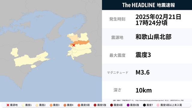 2月21日17時24分頃、和歌山県北部を震源とするマグニチュード3.6の地震が観測された。最大震度3を観測したのは、和歌山県。