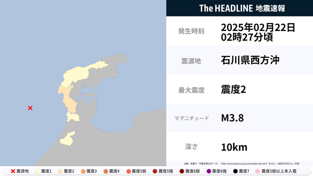 2月22日2時27分頃、石川県西方沖を震源とするマグニチュード3.8の地震が観測された。最大震度2を観測したのは、石川県。