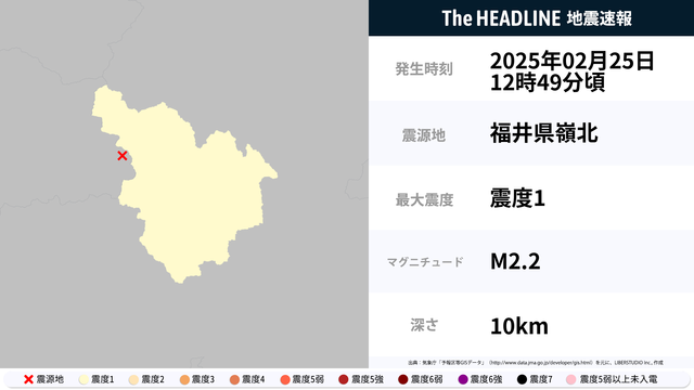 02月25日12時49分頃、福井県嶺北を震源とするマグニチュード2.2の地震が観測された。最大震度1を観測したのは、岐阜県。