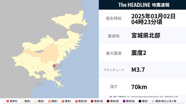 3月2日4時23分頃、宮城県北部を震源とするマグニチュード3.7の地震が観測された。最大震度2を観測したのは、岩手県。