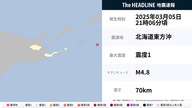 3月5日21時6分頃、北海道東方沖を震源とするマグニチュード4.8の地震が観測された。最大震度1を観測したのは、北海道。