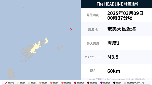 3月9日0時37分頃、奄美大島近海を震源とするマグニチュード3.5の地震が観測された。最大震度1を観測したのは、鹿児島県。