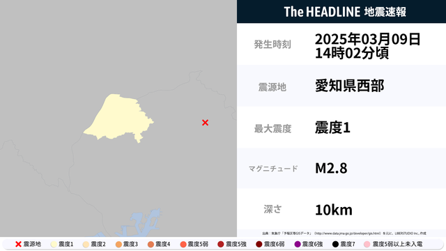 3月9日14時2分頃、愛知県西部を震源とするマグニチュード2.8の地震が観測された。最大震度1を観測したのは、愛知県。