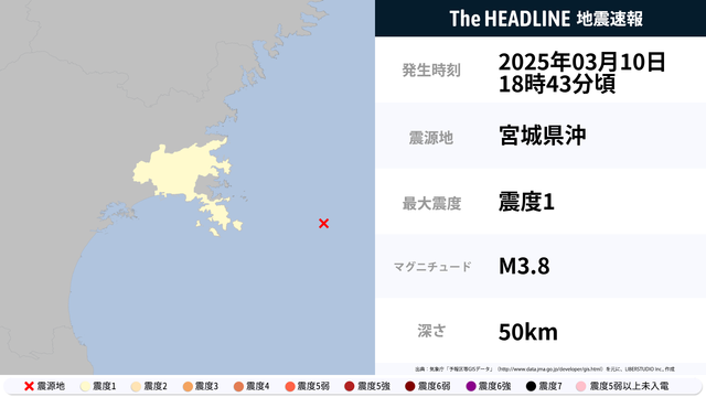3月10日18時43分頃、宮城県沖を震源とするマグニチュード3.8の地震が観測された。最大震度1を観測したのは、宮城県。