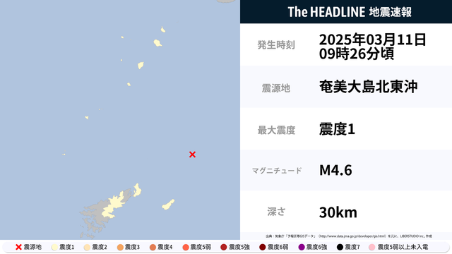 3月11日9時26分頃、奄美大島北東沖を震源とするマグニチュード4.6の地震が観測された。最大震度1を観測したのは、鹿児島県。