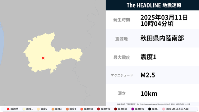 3月11日10時4分頃、秋田県内陸南部を震源とするマグニチュード2.5の地震が観測された。最大震度1を観測したのは、秋田県。