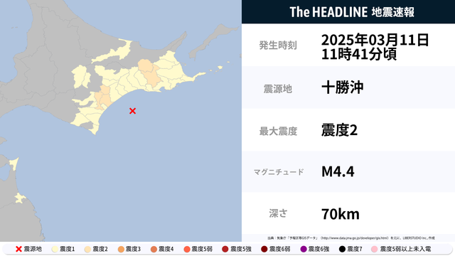 3月11日11時41分頃、十勝沖を震源とするマグニチュード4.4の地震が観測された。最大震度2を観測したのは、北海道。