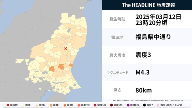 3月12日23時20分頃、福島県中通りを震源とするマグニチュード4.3の地震が観測された。最大震度3を観測したのは、茨城県。