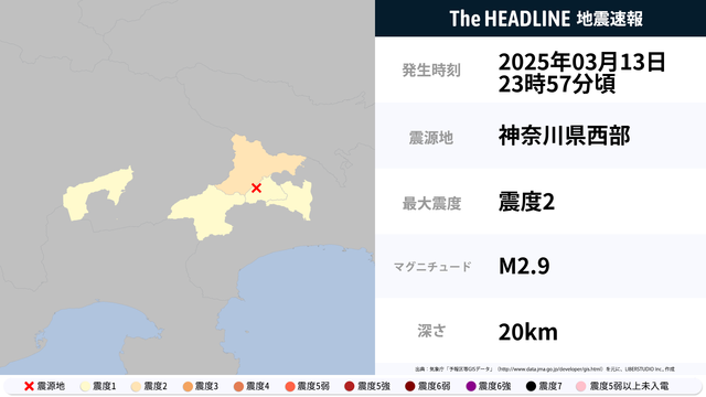 3月13日23時57分頃、神奈川県西部を震源とするマグニチュード2.9の地震が観測された。最大震度2を観測したのは、神奈川県。